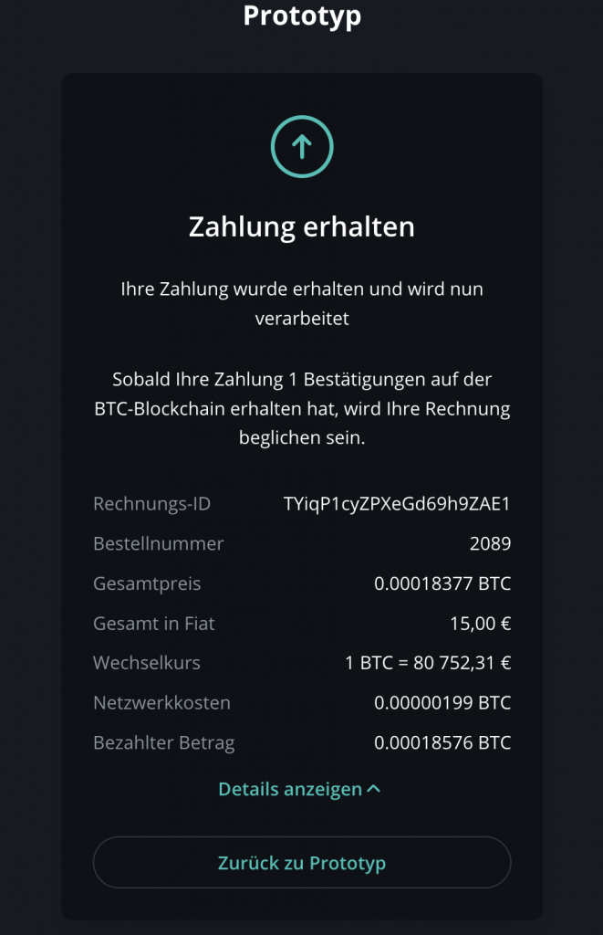 8.Sie sehen nun eine Bestätigung des Zahlungseinganges. Klicken Sie unten auf „Zurück zu Prototyp“, um auf den Zahlungsprototypen zurückzukehren.